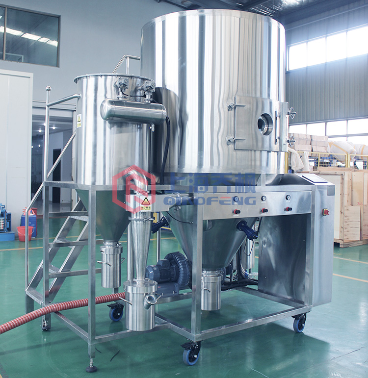 6.為了防止材料受到污染并延長設(shè)備的使用壽命,與材料接觸的所有部件均由不銹鋼制成。 噴涂后,液體霧化成分散的顆粒,表面積大大增加。 在與熱空氣接觸后,干燥過程可以在很短的時間內(nèi)完成。
