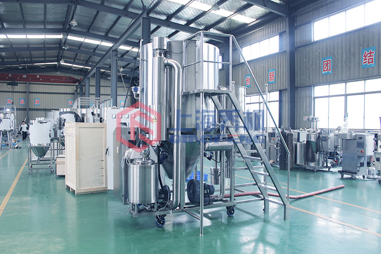 1.干燥速度快。 通過離心噴射液體后,表面積大大增加。 在高溫氣流中,95%-98%的水可瞬間蒸發(fā),干燥時間僅為幾秒鐘。在使用平行流噴霧干燥形式可以使液滴在與熱空氣相同的方向上流動。 雖然熱風(fēng)溫度較高,但熱風(fēng)進入干燥室并立即接觸噴霧液滴,室內(nèi)溫度急劇下降,材料的濕球溫度基本不變,因此也適用于干熱敏感 材料。