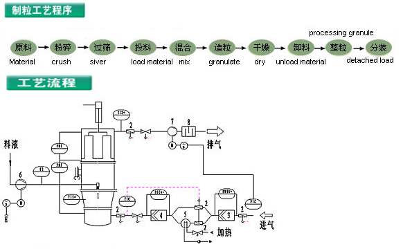 沸騰制粒干燥機利用換熱器加熱的空氣形成熱空氣,通過閥板將熱空氣分配到主機中。濕物料從進料機進入干燥機。由于氣壓的作用,物料在干燥器中形成沸騰狀態(tài),與熱風(fēng)廣泛接觸,在較短的時間內(nèi)完成物料的干燥。沸騰制粒干燥機是一種干燥設(shè)備,又稱流化床。一般由加熱器、沸騰床主機、旋風(fēng)分離器、袋式除塵器、引風(fēng)機、操作臺等組成。根據(jù)物料性質(zhì)的不同,可根據(jù)需要選用旋風(fēng)分離器或袋式除塵器。沸騰干燥機提高了流動性,減少了粉末造粒飛塵;通過粉末造粒提高了溶解性;在一臺機器中混合、造粒、干燥完成一步造粒;使用抗靜電濾布,設(shè)備安全運行;設(shè)置泄壓孔,一旦發(fā)生爆炸,設(shè)備人員不受傷害;設(shè)備無死角,裝卸料輕便快捷,沖洗干燥。凈,符合GMP規(guī)范。
