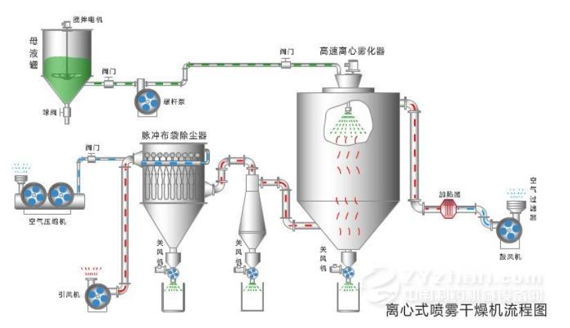 經過過濾和加熱后,空氣進入干燥機頂部的空氣分配器,熱空氣以螺旋狀均勻進入干燥室。 物料液體通過塔身頂部的高速離心霧化器或高壓霧化器噴入非常細的霧狀液珠中,并且可以在很短的接觸時間內干燥成成品 與空氣平行。 成品從干燥塔和旋風分離器的底部連續輸出,細粉塵通過脈沖袋式集塵器收集,廢氣通過風扇排出。